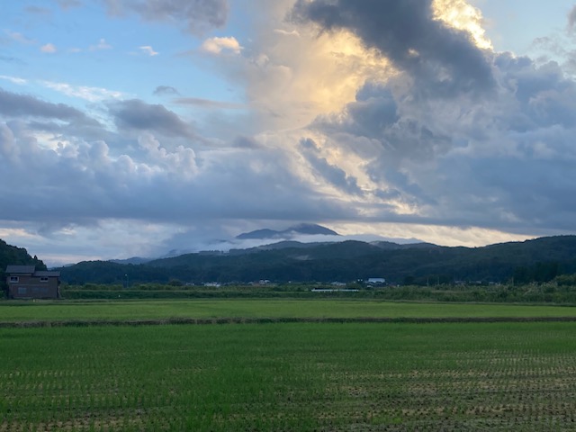 写真は、5時を過ぎて黒姫の山の雲が赤くなり始めた時刻、5時17分の撮影。