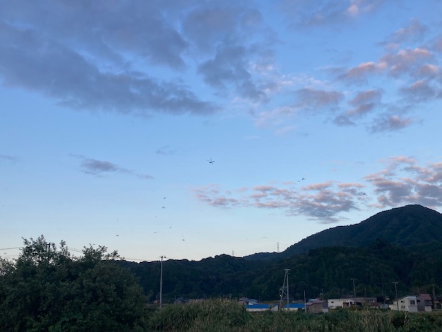 夕方の散歩道、鯖石川の堤防に無数のトンボが舞っていた。