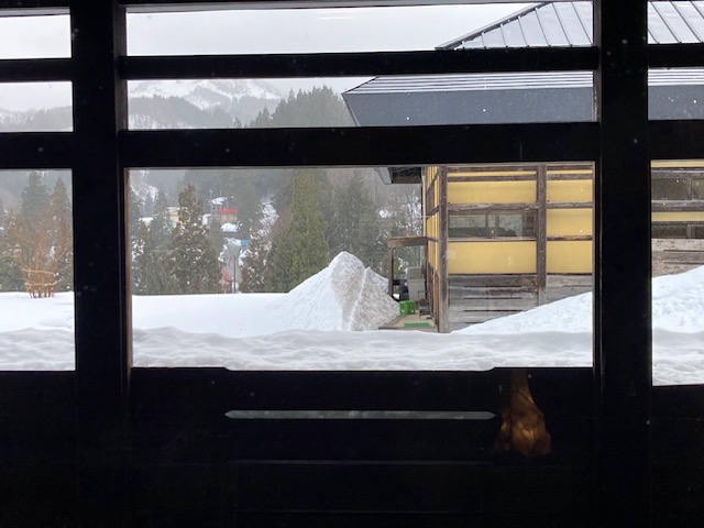写真は「じょんのび村」から湯屋と坪野集落、そして雪に霞む黒姫山