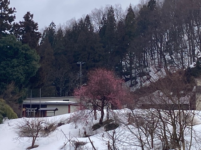 川東線を走っていたら、雪の中で梅が咲いていた。