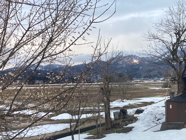 写真の向うで八石アルプスに夕陽が当り光っていた。