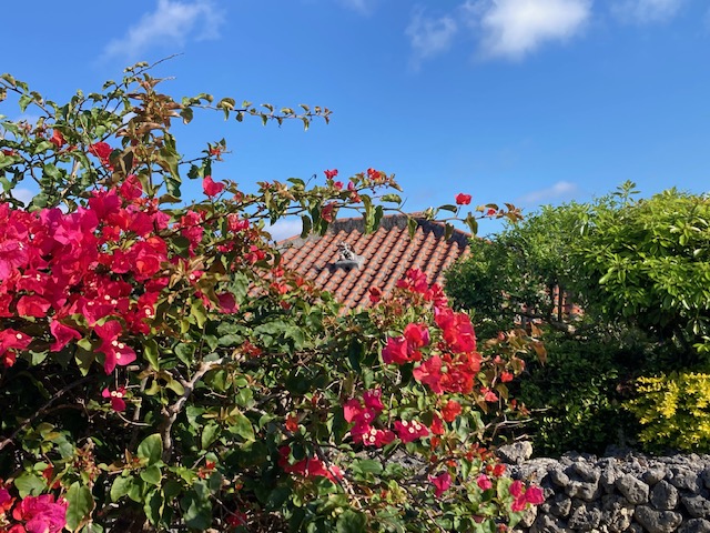サンゴの石垣で屋根にシーサーが守る家を囲み、「静寂」を大事にしている。