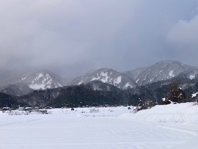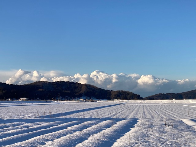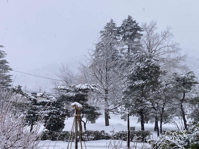 気温が2度に上がって、花のような杉の木の雪も落ち、道路の雪も消えた。